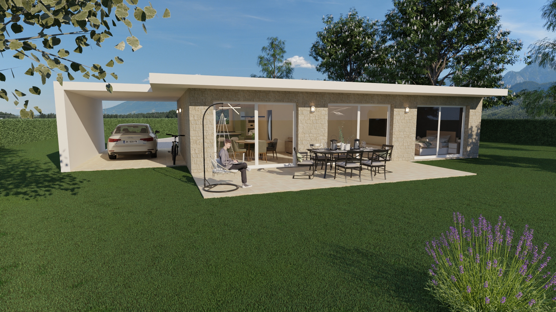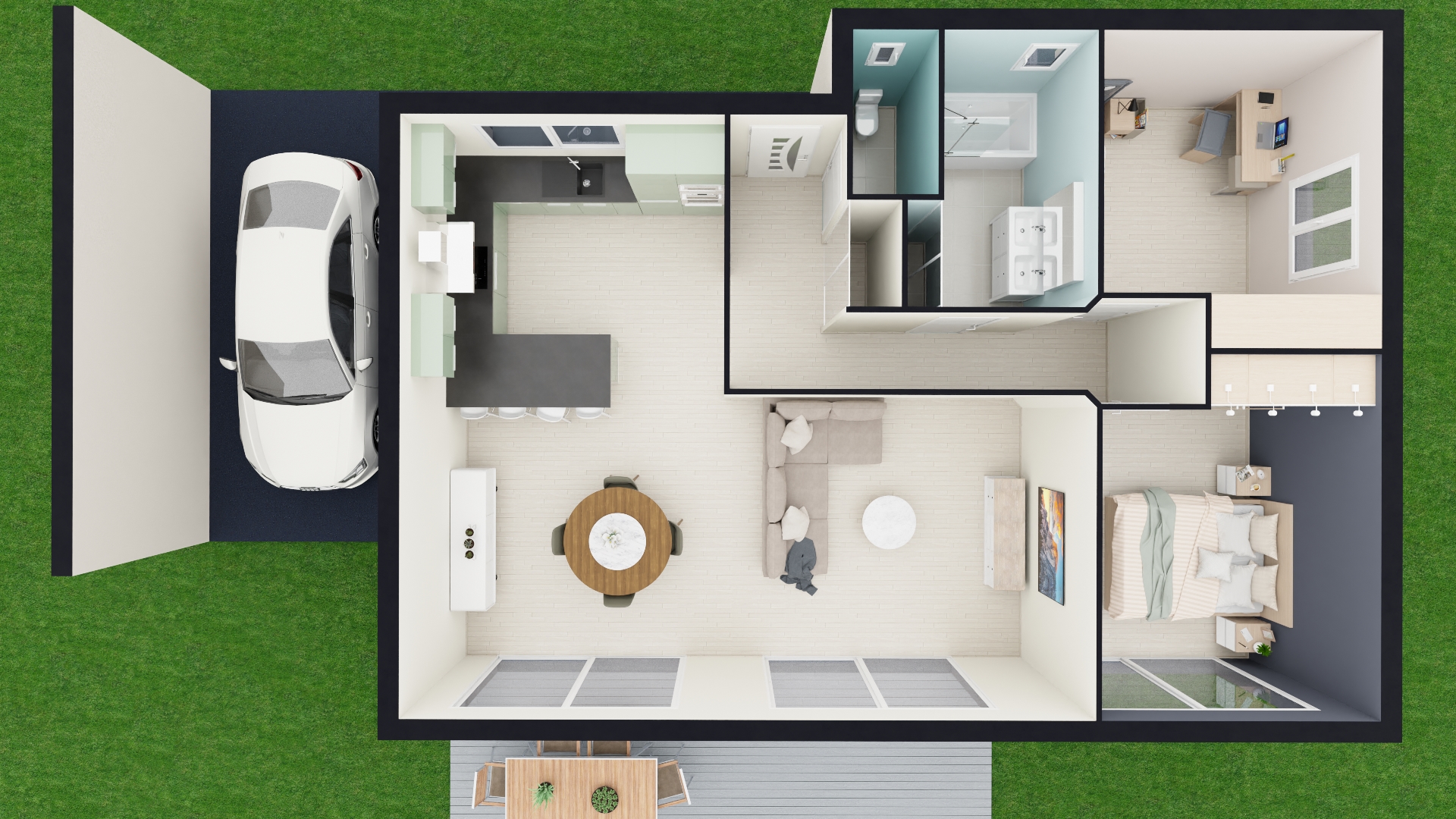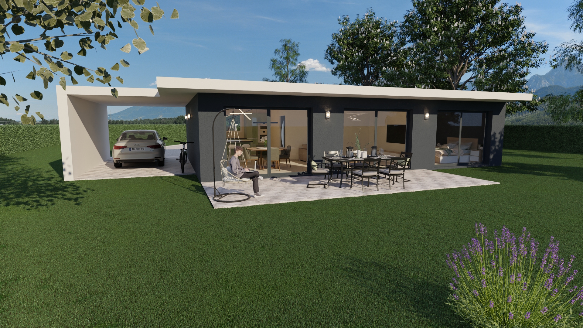 D’une surface de 97 m², ce Moduly’S XL est dotée de belles baies vitrées toute hauteur dans le salon et la chambre avec une vue exceptionnelle sur les extérieurs.