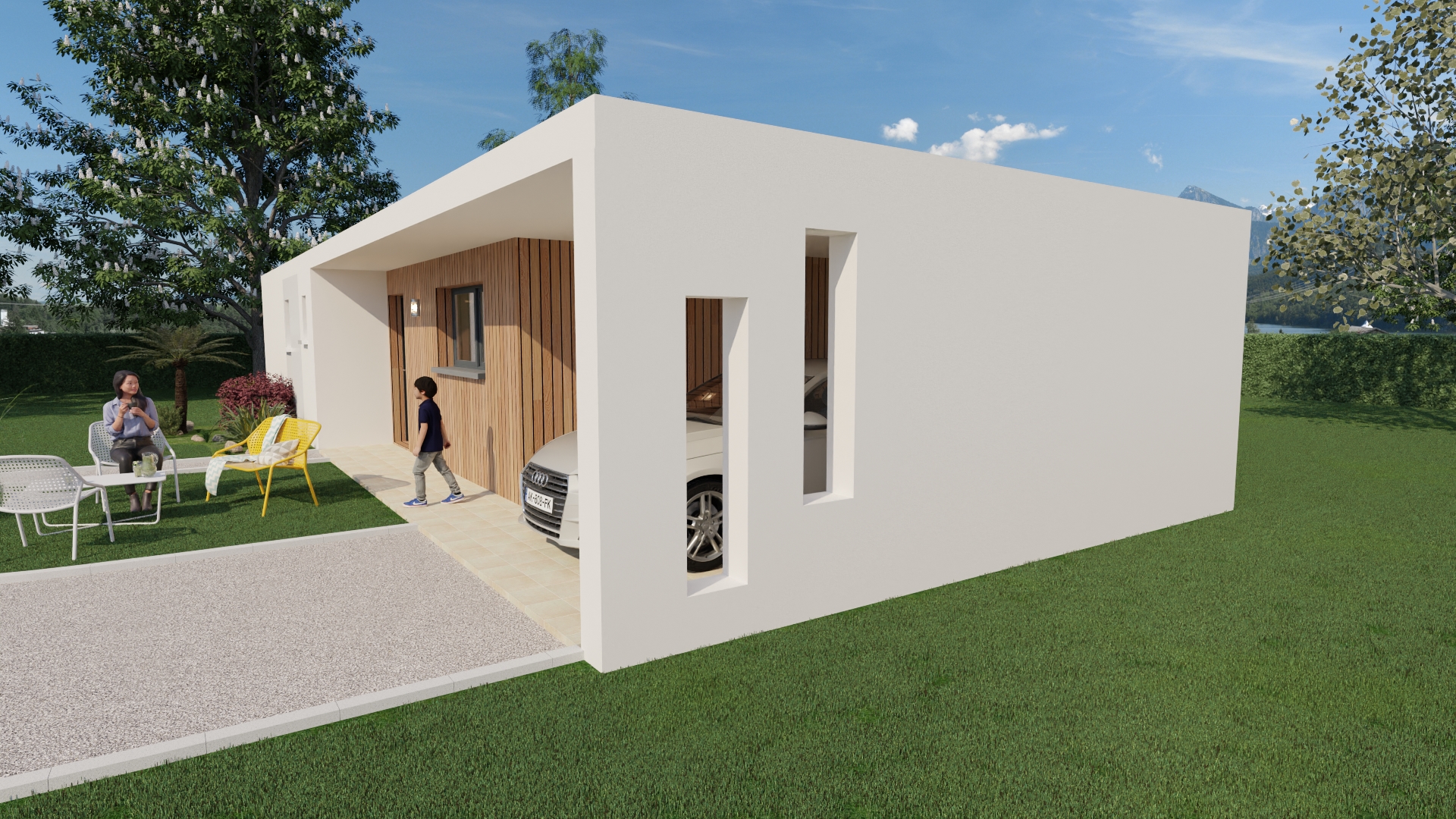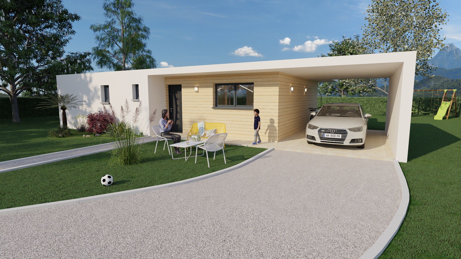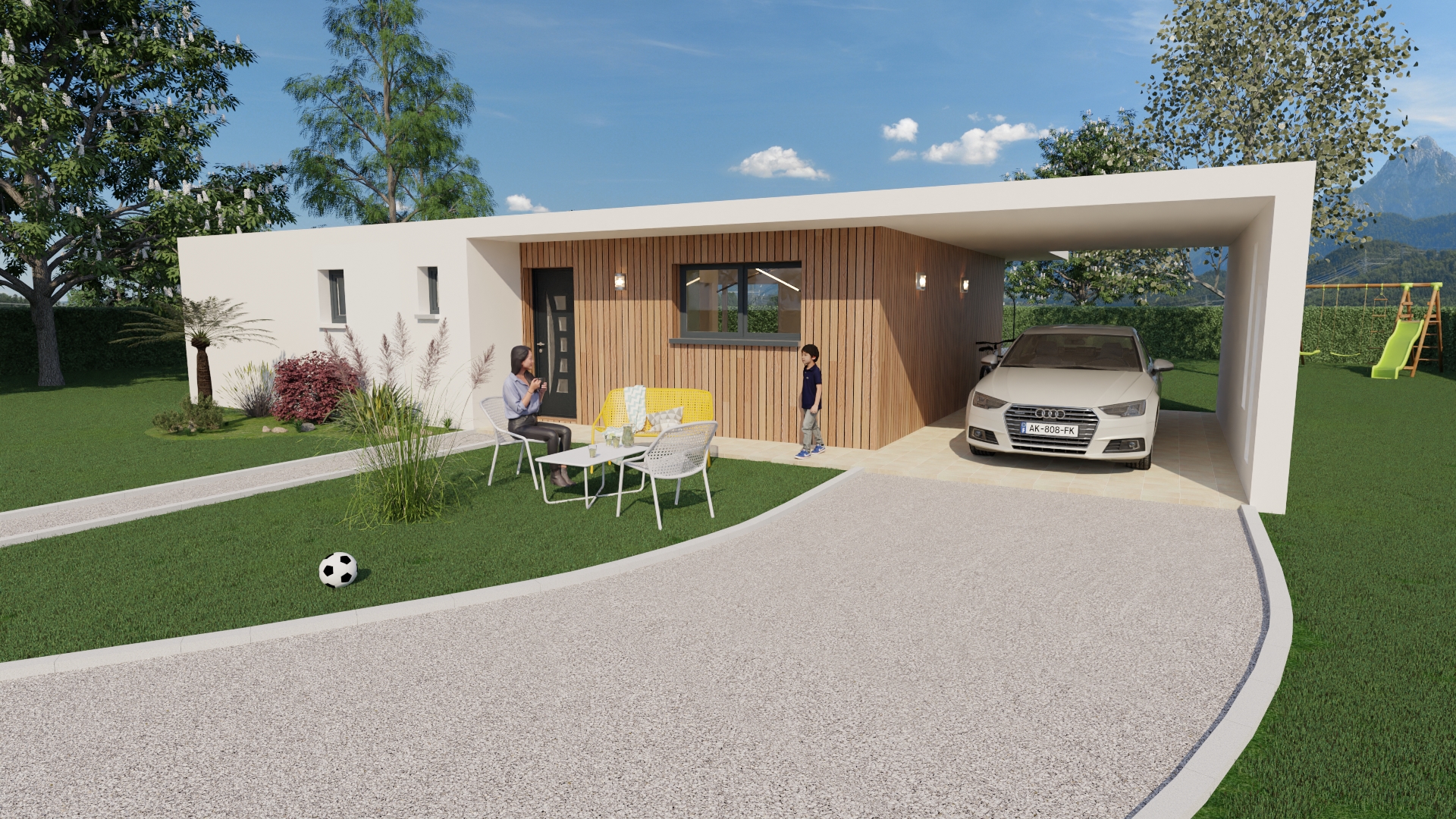 Il se distingue par son toit plat très légèrement incliné. Une façade bi-teinte à l’entrée apporte un aspect pétillant et sobre à la fois, tandis qu’un enduit matricé lui confère un rendu ultra moderne.